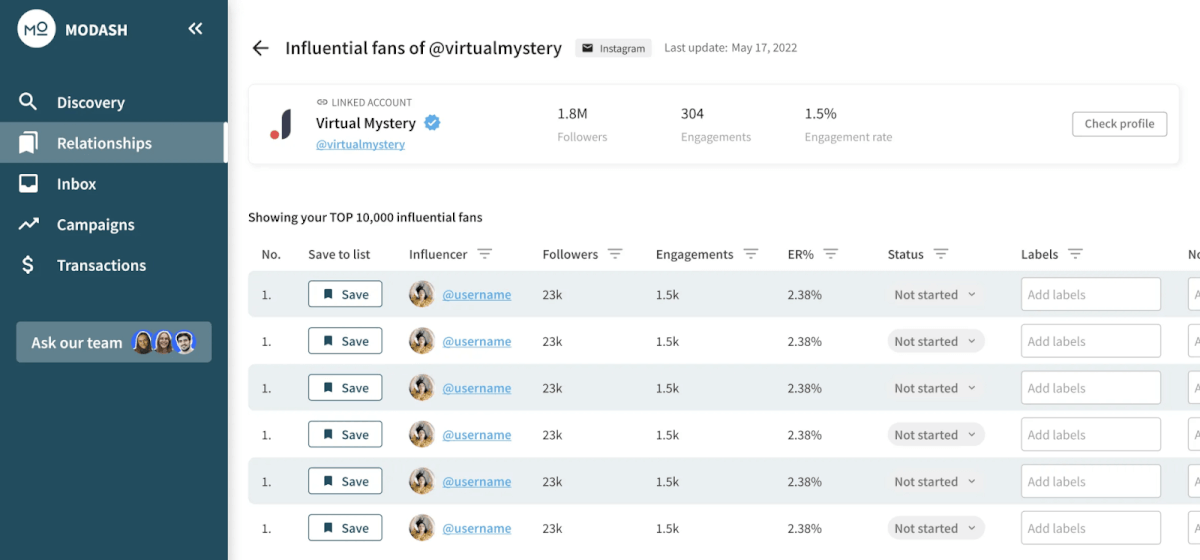 The most efficient solution is to speed up the influencer search process and surface more relevant results by using an influencer search tool like Modash to search and filter every influencer on Earth đ.