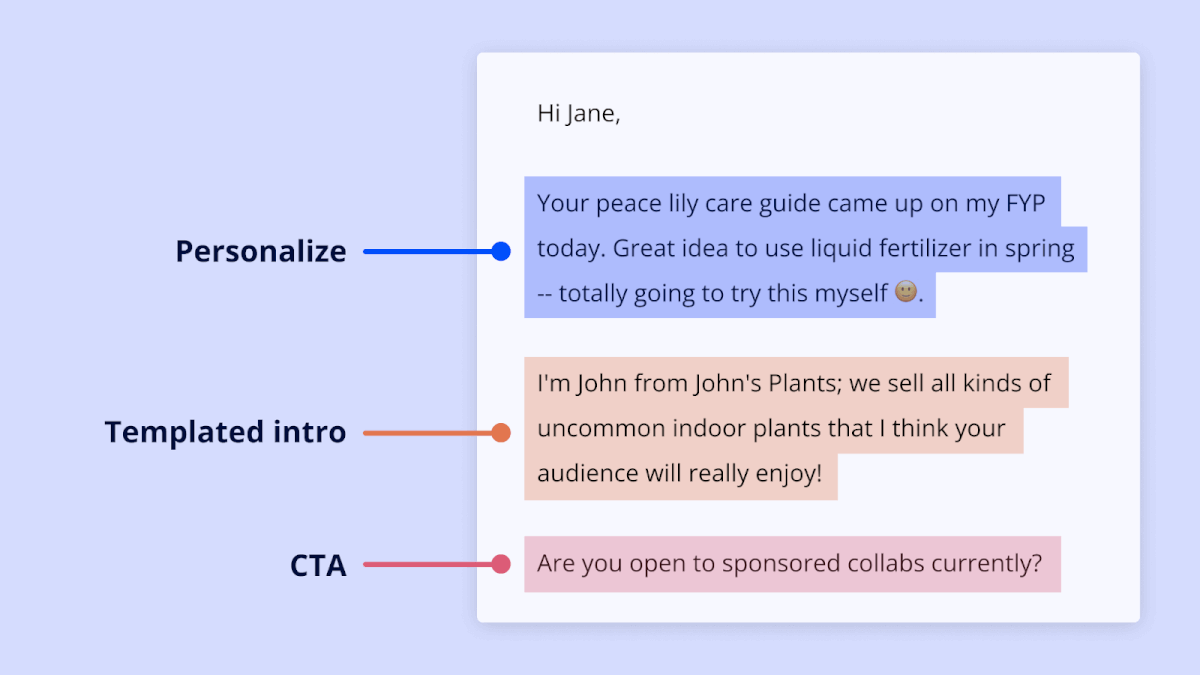 To be clear, weâre not telling you to write every email from scratch. Rather, personalize copy thatâs specific to the influencer youâre targeting â such as complimenting their content and explaining why theyâd be a perfect fit for your campaign. Meanwhile, use boilerplate text for generic details about your brand and product.