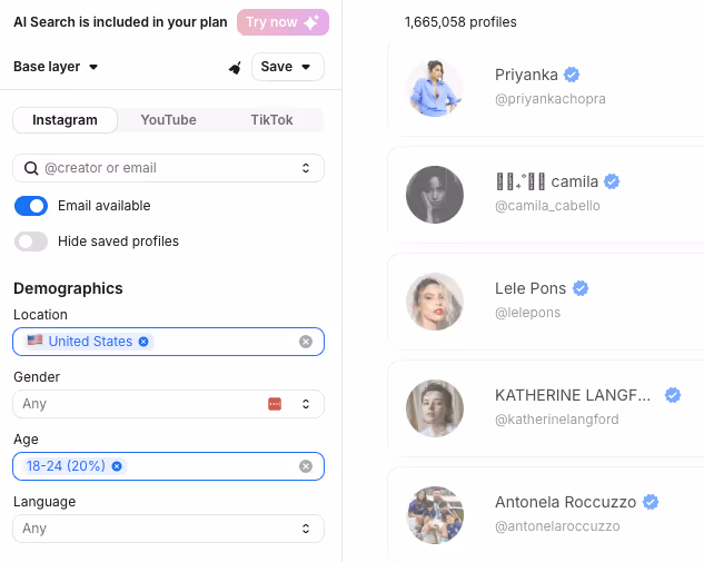 - Search engine helps you narrow results to find creators based on 20 key insights, or you can save time using the platform’s AI search tools.
