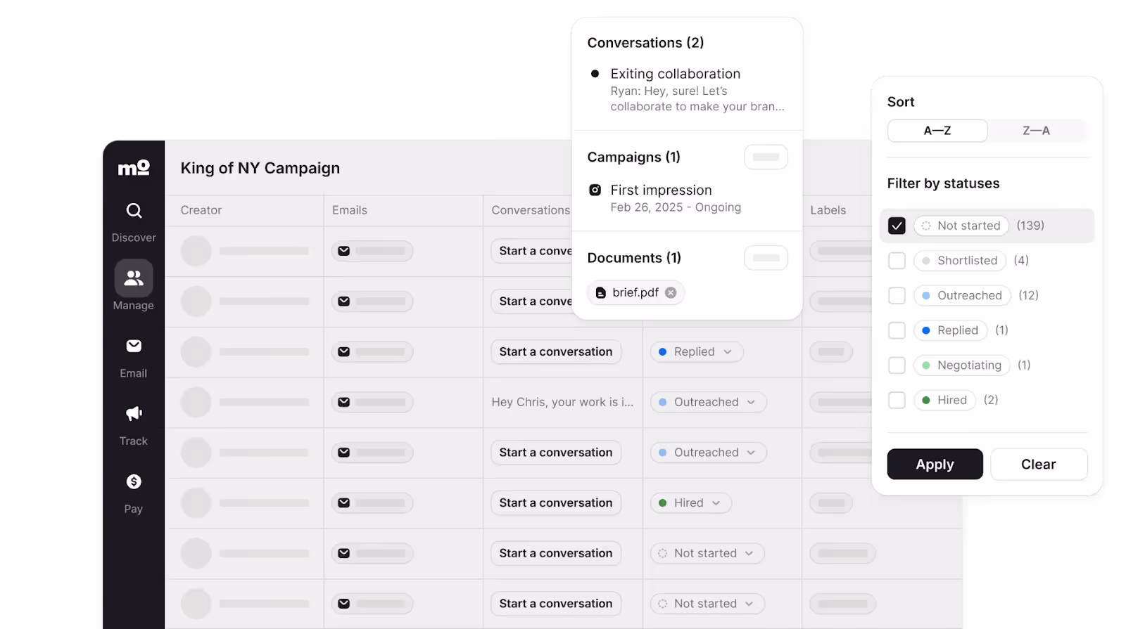- Assign a status to every influencer on your lists (like Outreached, Hired, or Rejected).