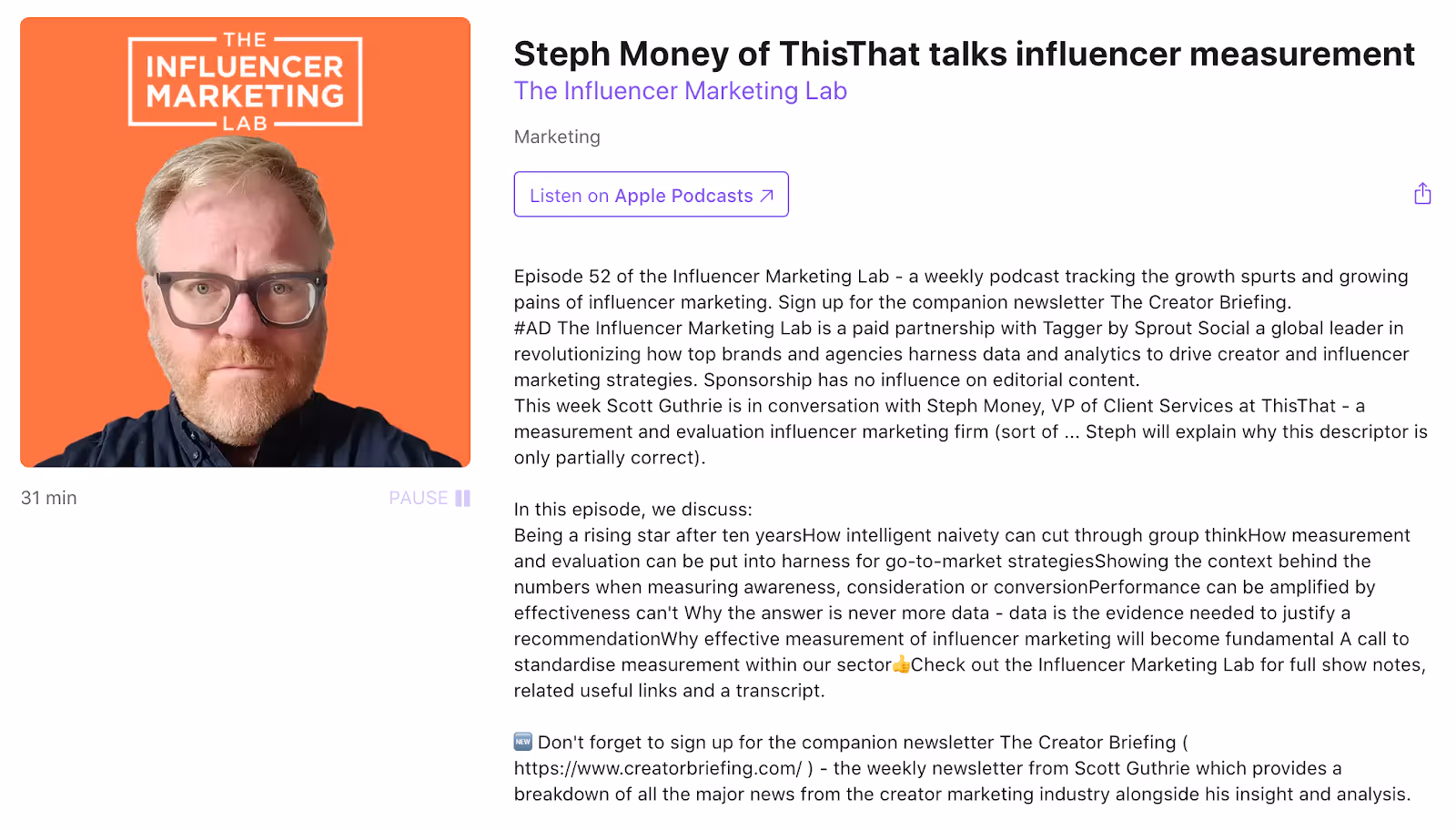 Let's look at this episode covering influencer measurement with Steph Money of ThisThat.