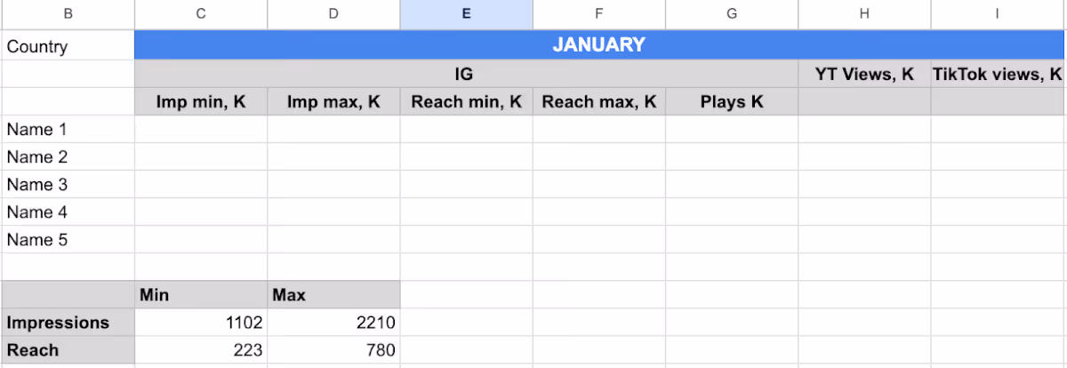 For example, Deeper would report the above numbers as, “January reach was 223–780K and impressions were 1102–2210K,” in the slide.