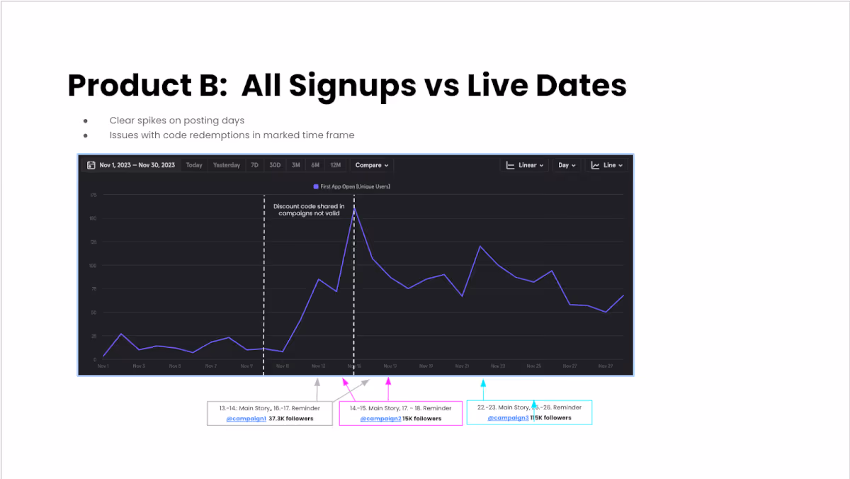 5. All signups vs live dates: the last slide shares a graph showcasing whether or not there was a spike in sign-ups when an influencer post went live. Anna-Maria Klappenbach, Community & Brand Marketing Lead at Aumio, shared she added this correlation slide because the jump in sign-ups don’t necessarily show in code redemptions.