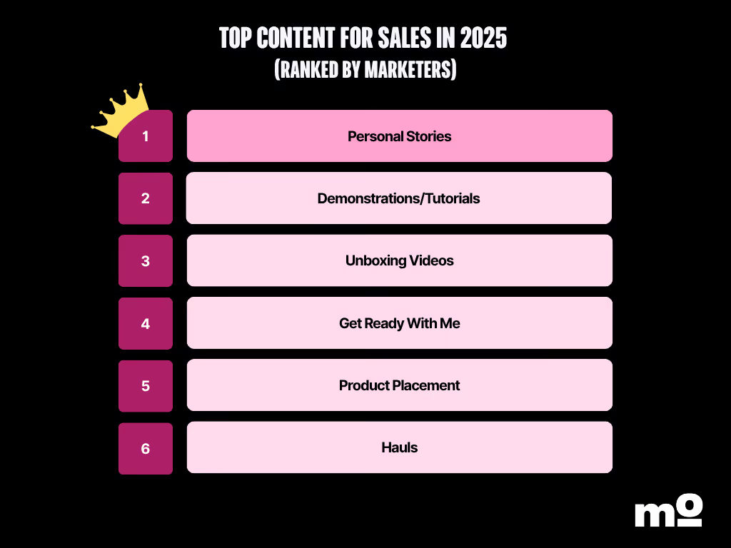 The takeaway: itâs best to put your top focus on personal stories for both brand awareness and sales campaigns (storyfit creators will be a natural here!). Beyond that, focus on GRWM videos for brand awareness and product tutorials/bottom of funnel content for sales campaigns.