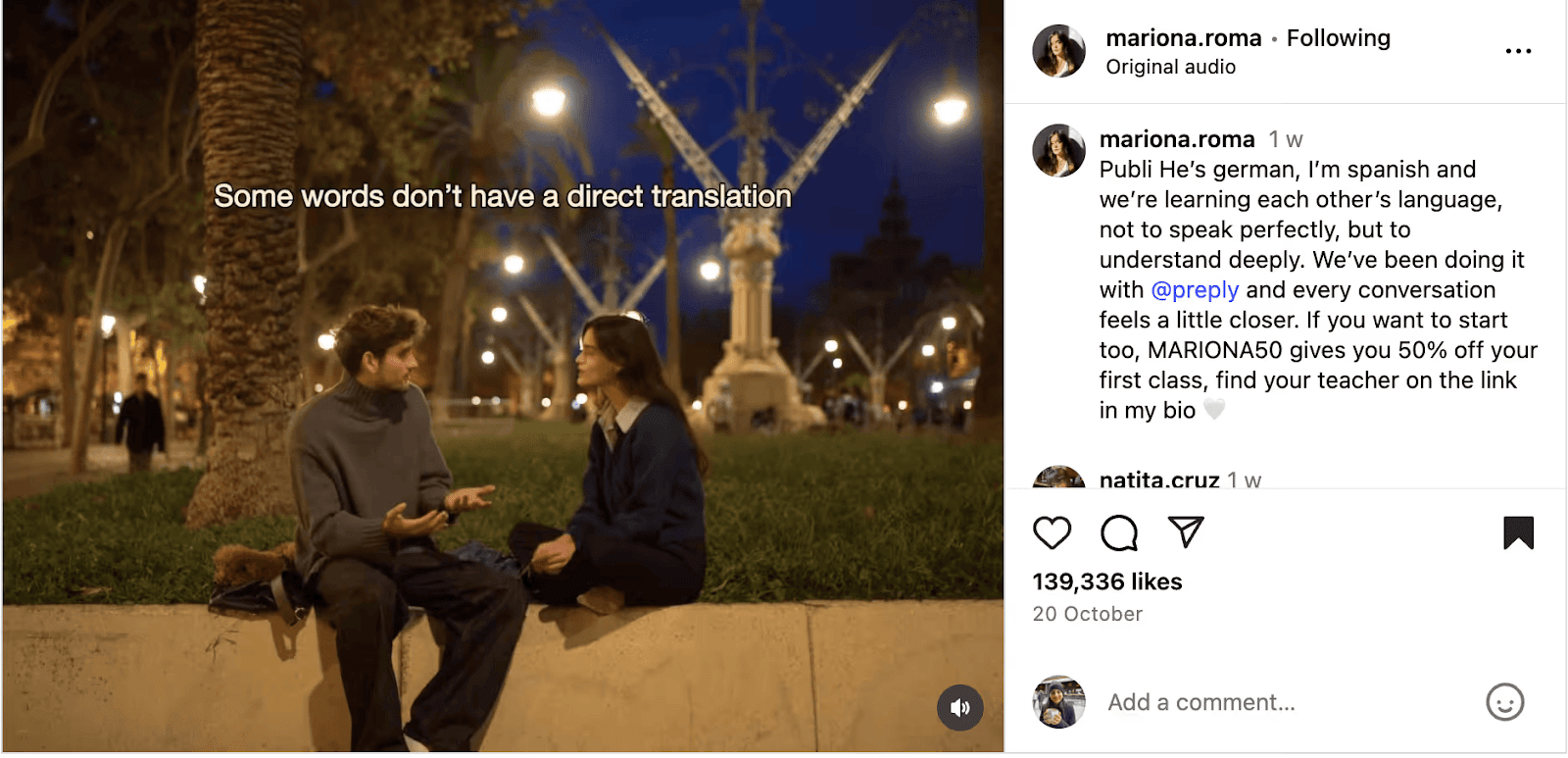Marionaâs partnership with Preply is the perfect example. The creator showcases how sheâs using the tool to learn her partnerâs native language because some things donât have a direct translation. The concept is personal and unique. Plus, the video is extra memorable, showing us a few of the un-translatable words.