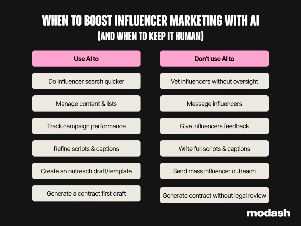 The tricky bit, though, is strong creator relationships are the foundation of successful influencer marketing. And you canât automate personal touch using artificial intelligence. Itâs critical to strike a balance where you use AI to move faster for your tedious tasks without sacrificing your influencer relationships. Anna JÄdrzejewska says it best: