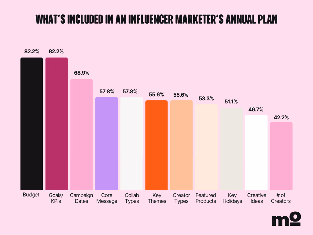 Marketers cite budget and goals/KPIs as must-haves in their annual planning, followed by campaign dates, collab types, core messaging, key themes, etc.