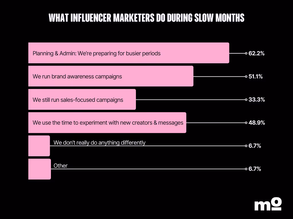 Slower periods are the perfect time to step outside your comfort zone. Experiment with influencers outside your niche and find gems you wouldâve missed otherwise. You can then work with the best-performing creators during busy periods to stack the deck in your favor.