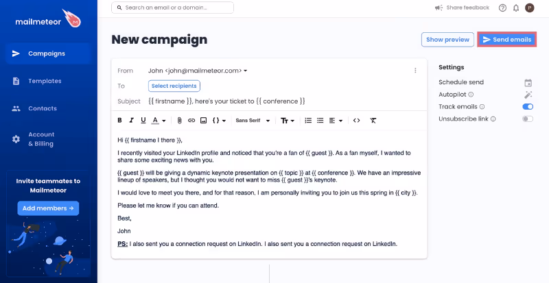 Price: Mailmeteor lets you send up to 500 emails per month free of charge. To send more, upgrade to a paid plan from $4.99 per user per month.