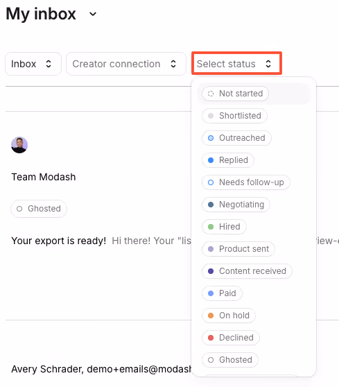 - Organize your inbox. Filter emails so you only see those involving influencers, or sort by outreach status to instantly track down influencers who are ready to be contacted or who are waiting for a follow-up.