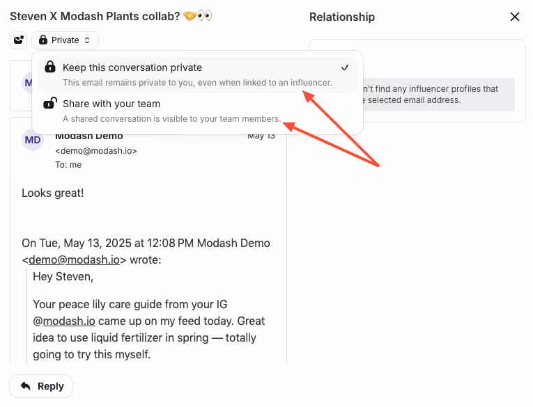 - Collaborate on influencer outreach. Share conversations with your colleagues so they can seamlessly handle communication when youâre on leave. (And with our privacy settings, you can control who sees what.)