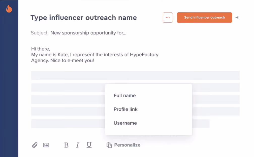 - Customize your influencer outreach. Make your outreach feel more human by personalizing with full names, usernames, images, and profile links.