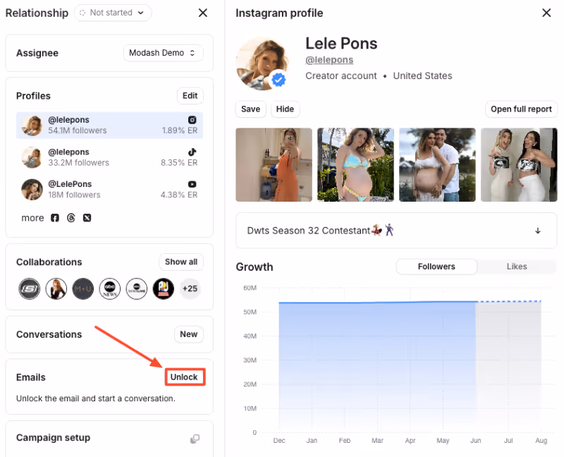 - Track down influencer email addresses. Use Modashâs built-in search feature to find publicly available email addresses for individual influencers. Or add multiple influencers to a list and unlock their contact details in bulk.Â