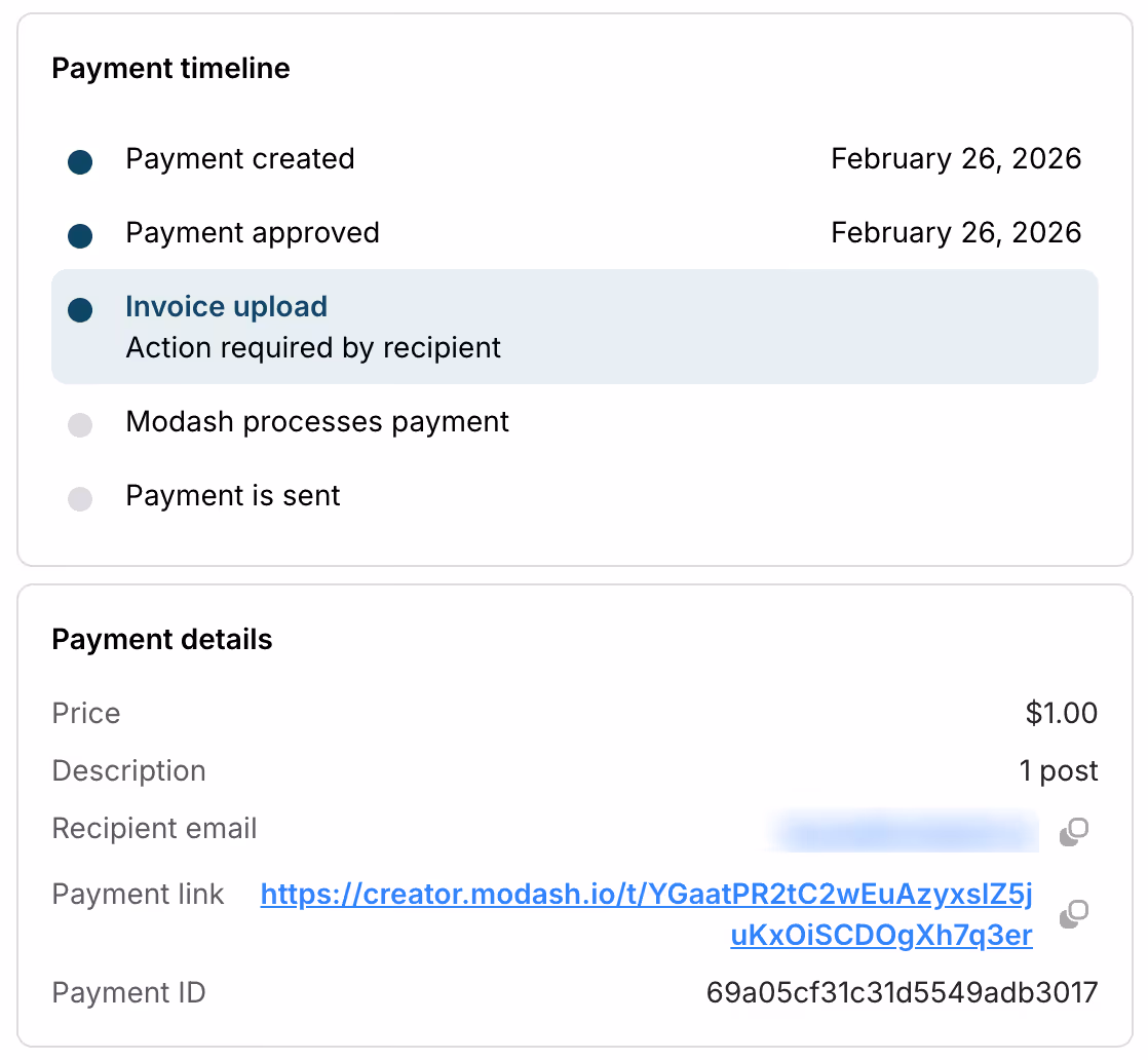 - Automate boring (but essential) payment admin: When you create a payment transaction in Modash and share a personalized link with the influencer, we automatically handle their onboarding by collecting their payment details, managing invoices, handling tax compliance, and processing payouts.