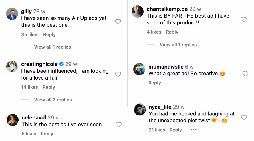 Here’s my favorite example of a storyfit collaboration that uses the unique content format type: the partnership between airup (a water bottle) and filmmaker Bibi-Jane Angelica. On the surface, a water bottle brand and a filmmaker have no business collaborating. But when they do? The post they build is creative and unlike any other partnership airup has done. And it’s not just me – see the comments for yourself: