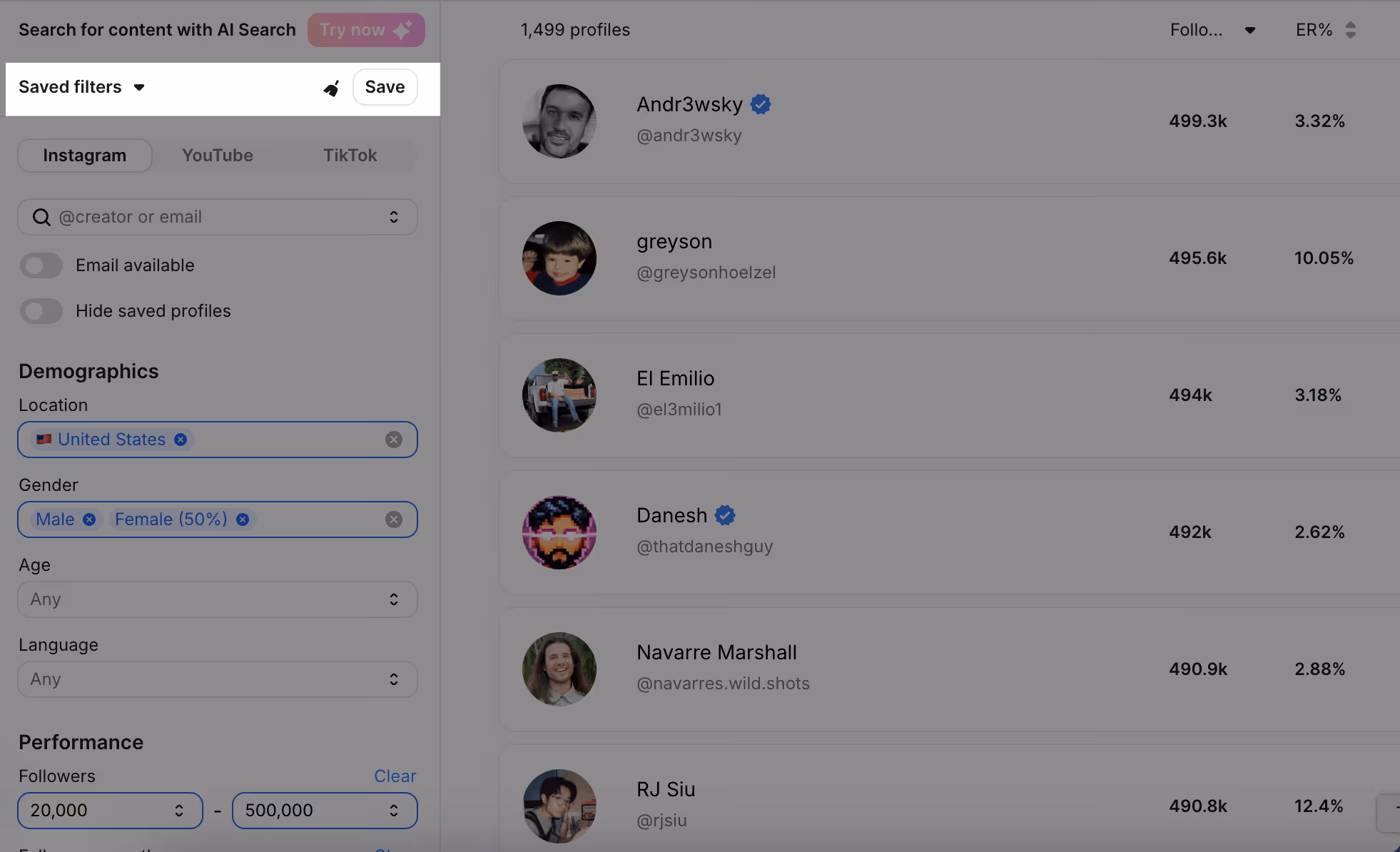 In Modash, you can even save your most-used filters so you don’t have to select them each time you want to search for the same kind of creators.
