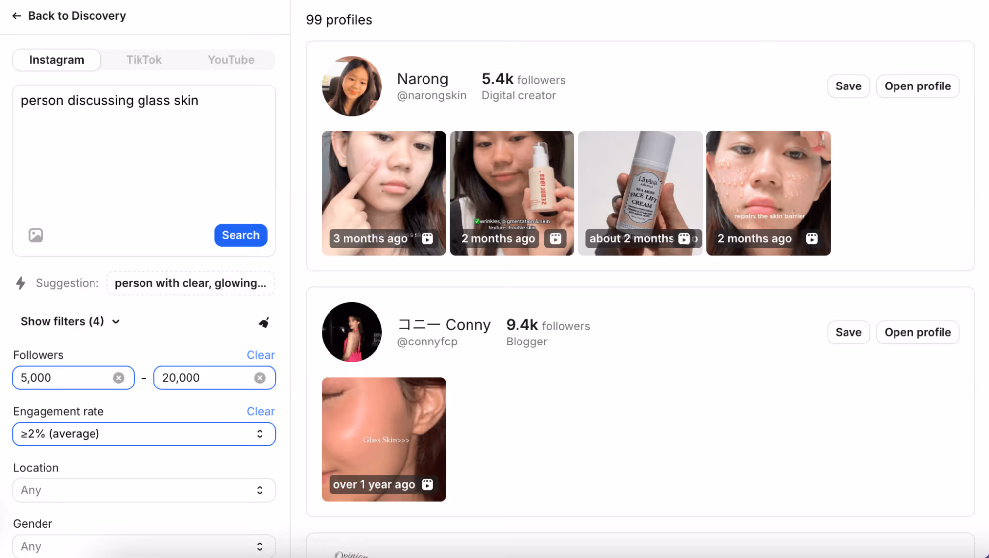 You can even use Modash’s AI search to describe the kind of content you’re looking for – and find creators who make exactly those kinds of posts. For example, I searched for “person discussing glass skin” and layered in filters like follower count, location, and engagement to find 99 influencers who matched all of those criteria.