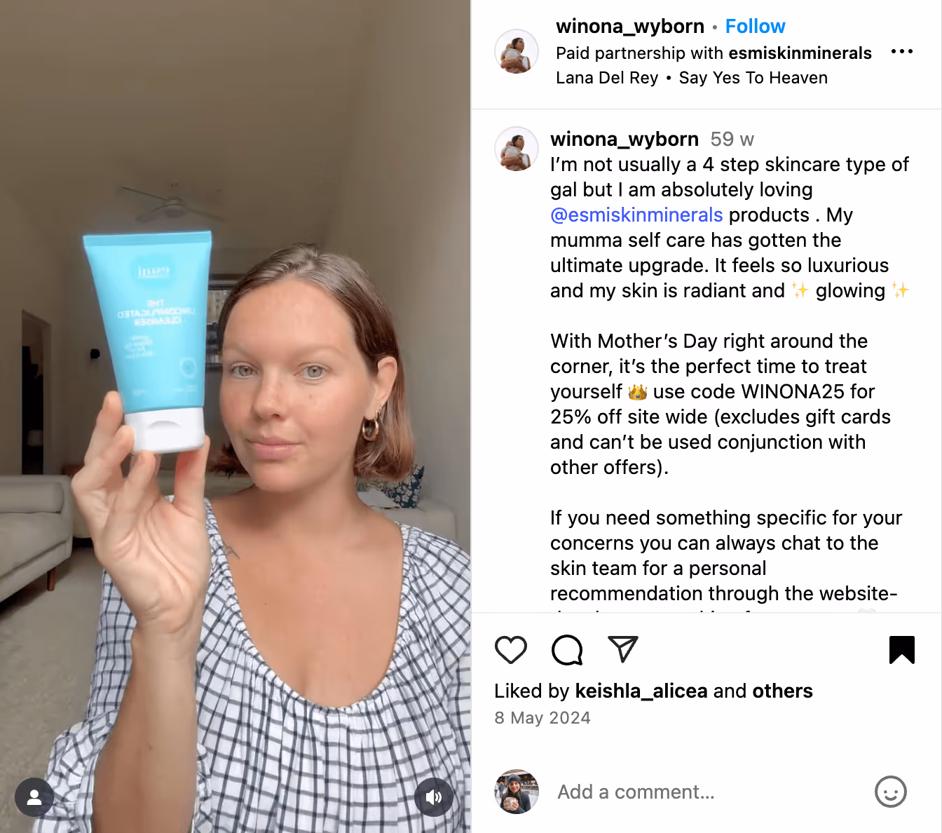 Take this example of a skincare brand, Esmi, collaborating with a mom influencer, Winona.