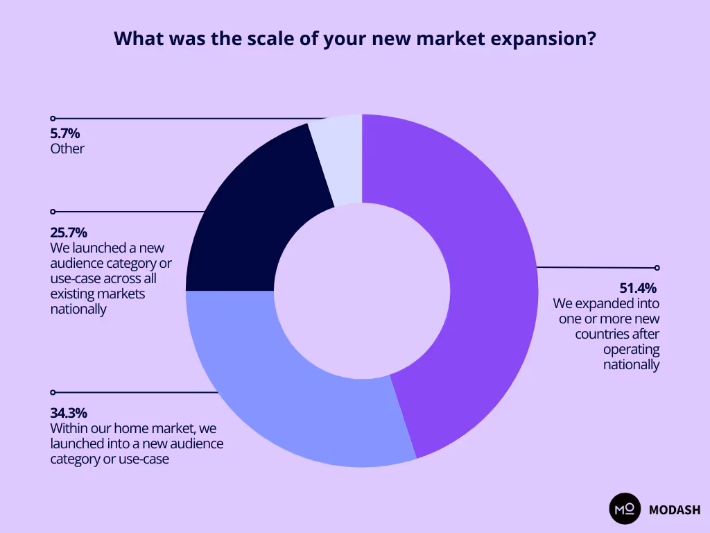 In our survey, 51% of participants had experience with international expansion, 34% had expanded into a new region in their own country, and 26% had so far expanded into a new cohort of customers.