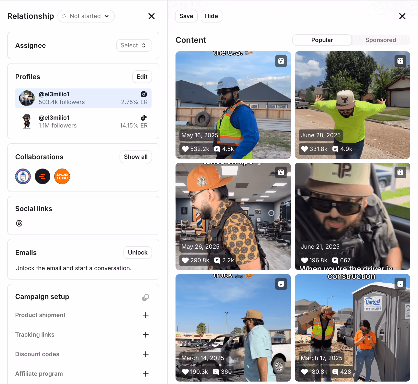 In Modash, you can easily check a creator’s popular posts and past sponsored content. Clicking on any post will instantly take you to the original URL.