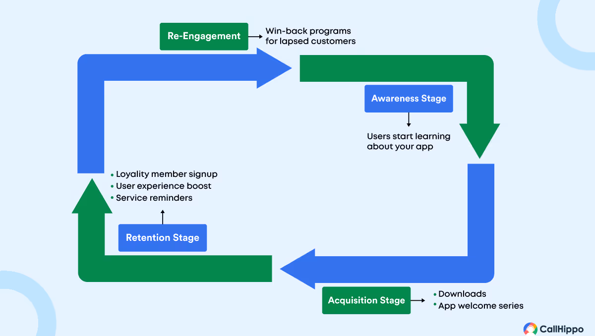 Mobile app marketing guides the user through every step of the marketing funnel - from creating awareness to the acquisition to retention and re-engagement. At times, app users might go back and forth from one stage to another, and hence it is also known as the mobile engagement lifecycle.