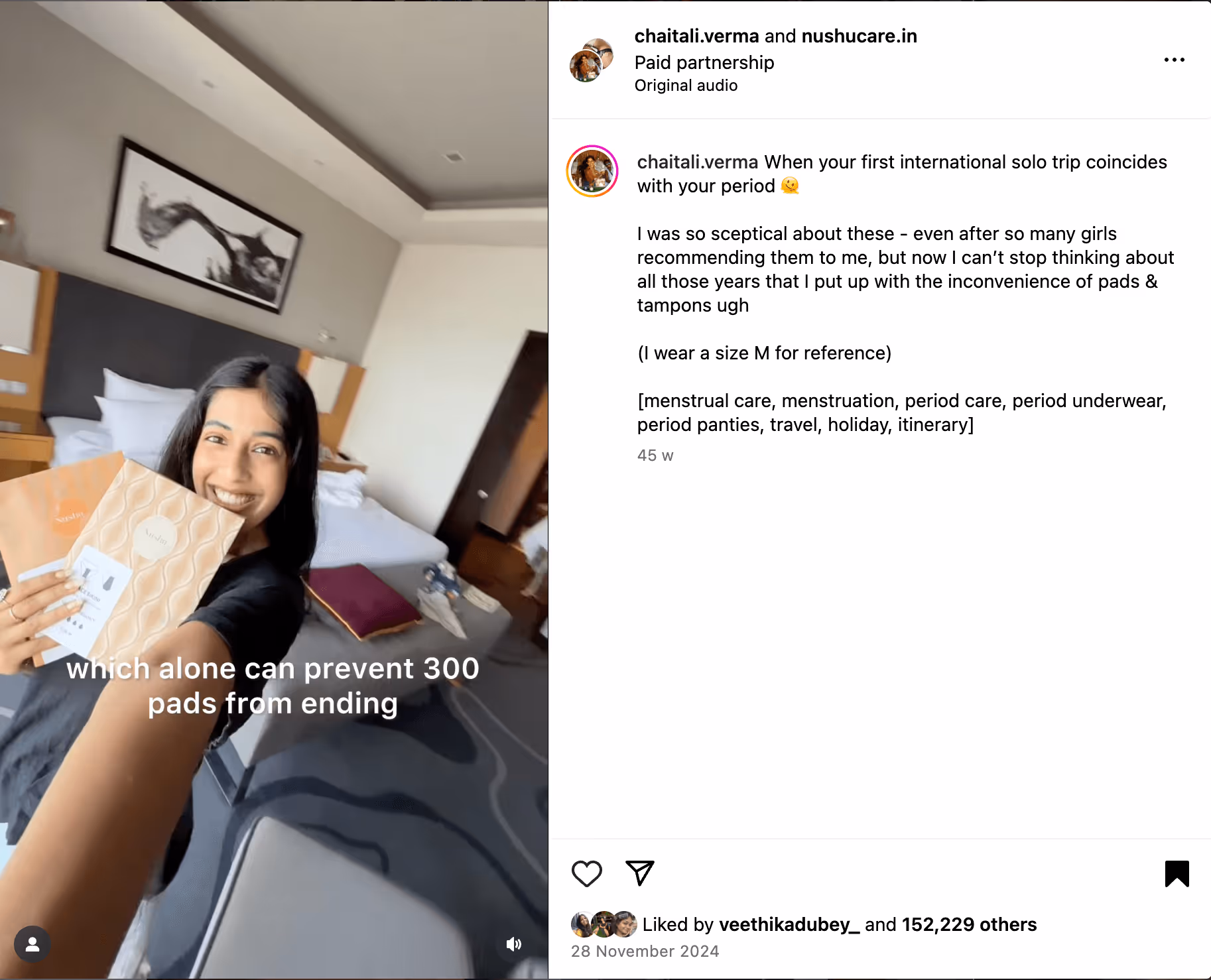 To give you an example of how storyfit influencers work in practice, check out this collaboration between Chaitali Verma and Nushucare. The influencer tested how the product held up during an international trip â a use case addressing a specific concern of the brandâs target audience.