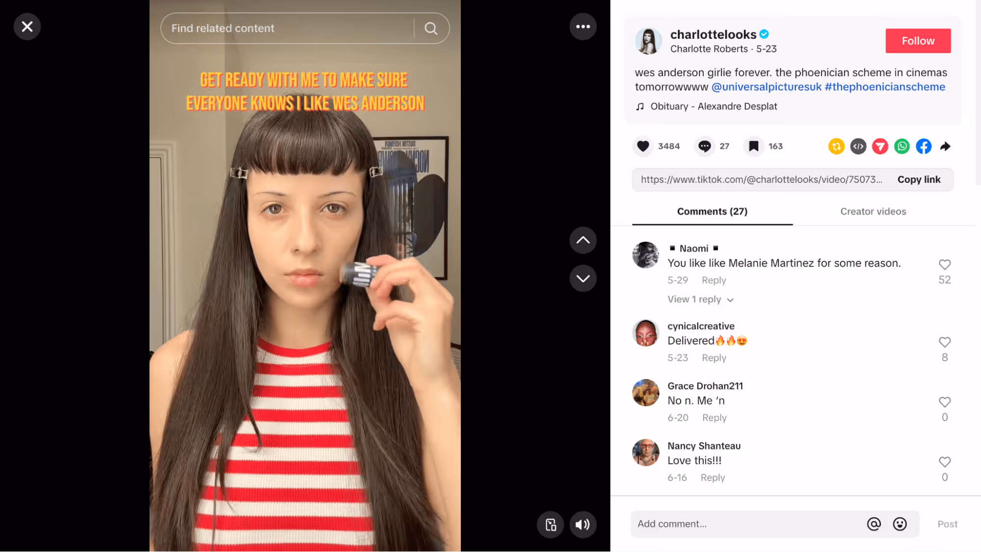 For example, Charlotte Roberts promoted the movie The Phoenician Scheme for Universal Pictures UK in the Wes Anderson trend. It fits the bill perfectly â Charlotte nails the unique style, and itâs nicely integrated into Universal Picturesâ brand as a whole.