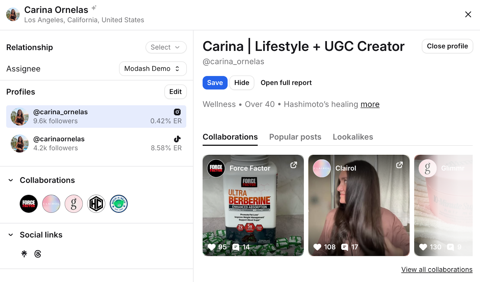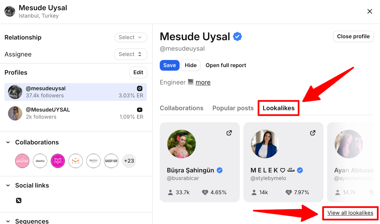 Alternatively, if you prefer something faster and more reliable, Modash lets you instantly scale your results by viewing a list of lookalike creators with similar audiences and niches. Just click the Lookalikes tab in the creatorâs profile, scroll through the results, and/or hit View all lookalikes to browse in more detail: