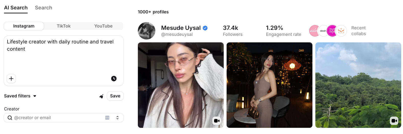 Or use our AI Search tool to find creators based on the images and videos they post, not just the captions and hashtags they write. Give us a natural language query like âlifestyle creator with daily routine and travel contentâ and weâll use our knowledge of influencer content â based on analyzing literally billions of social posts â to surface all the relevant accounts on Insta, TikTok, and YouTube.