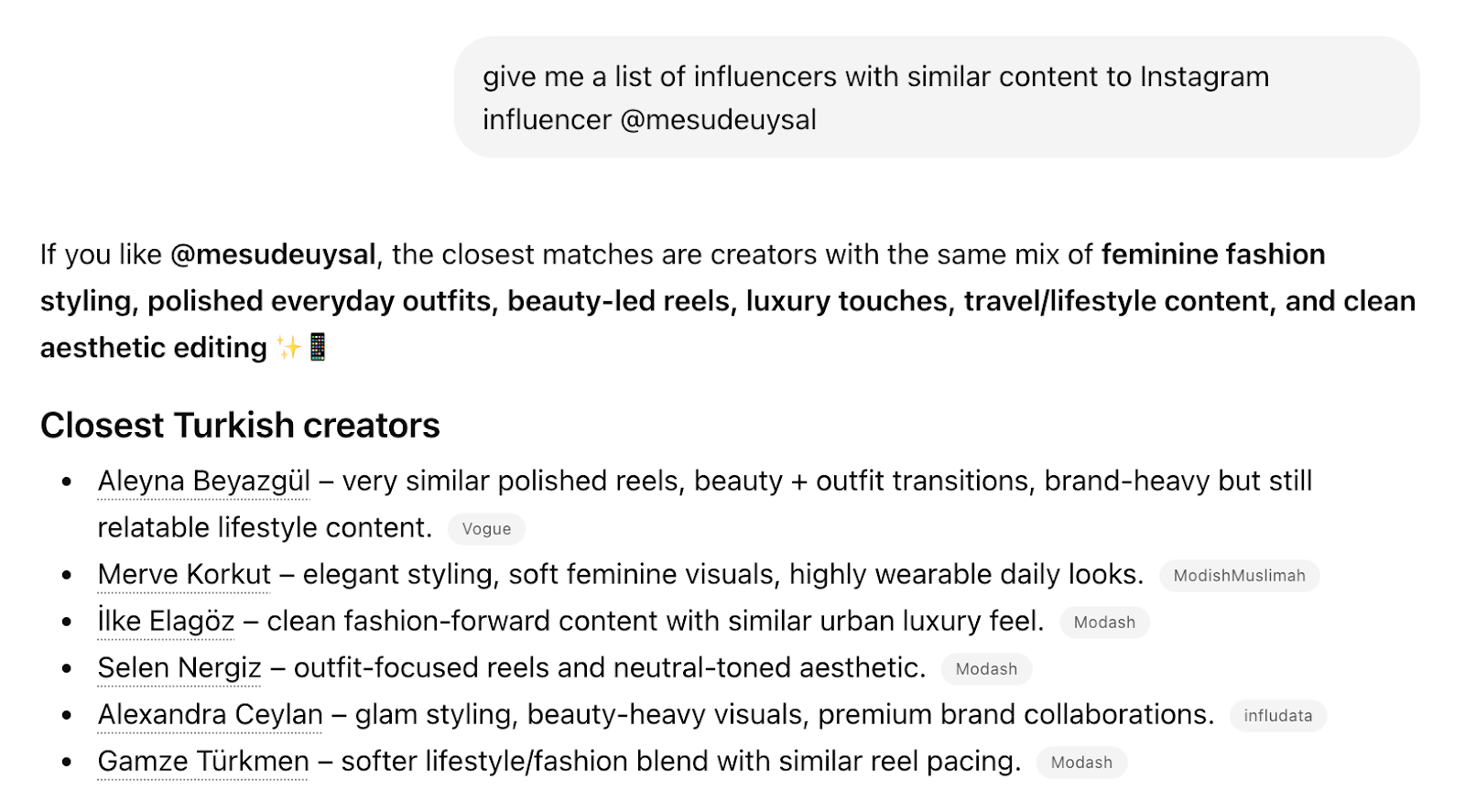 Thereâs no watertight way to do this manually. Your best bet is probably to ask ChatGPT (or your Gen AI tool of choice) for a list of creators who post about similar stuff to your preferred influencer: