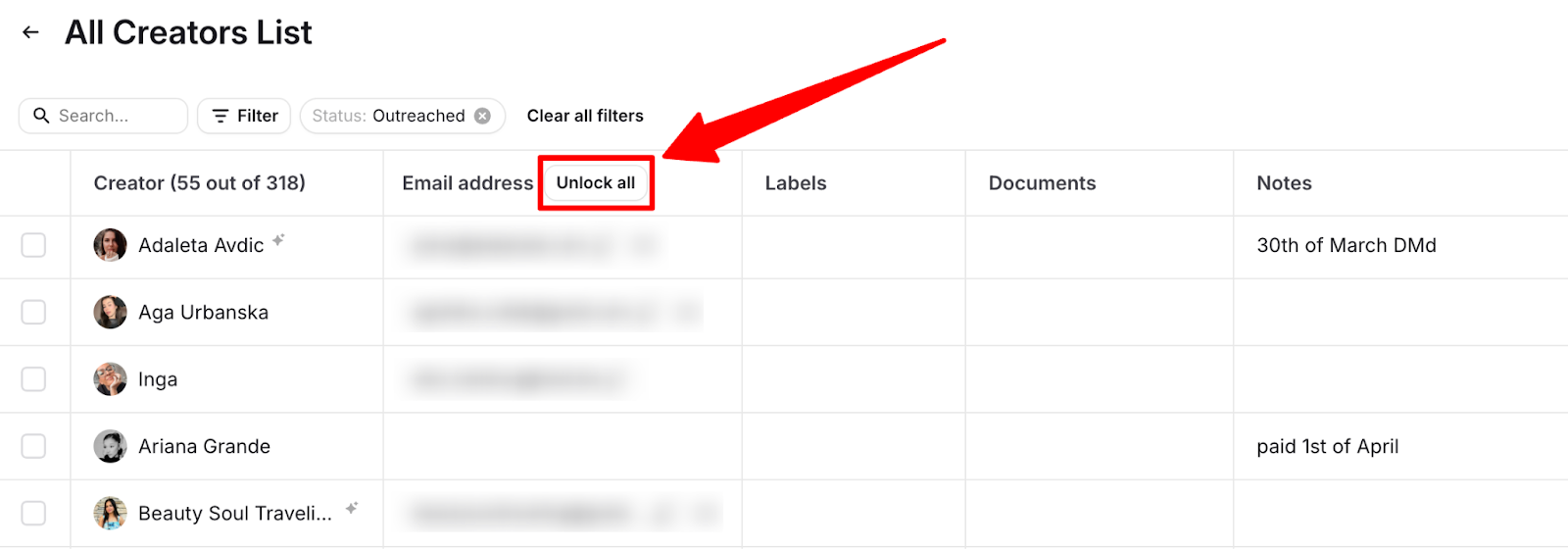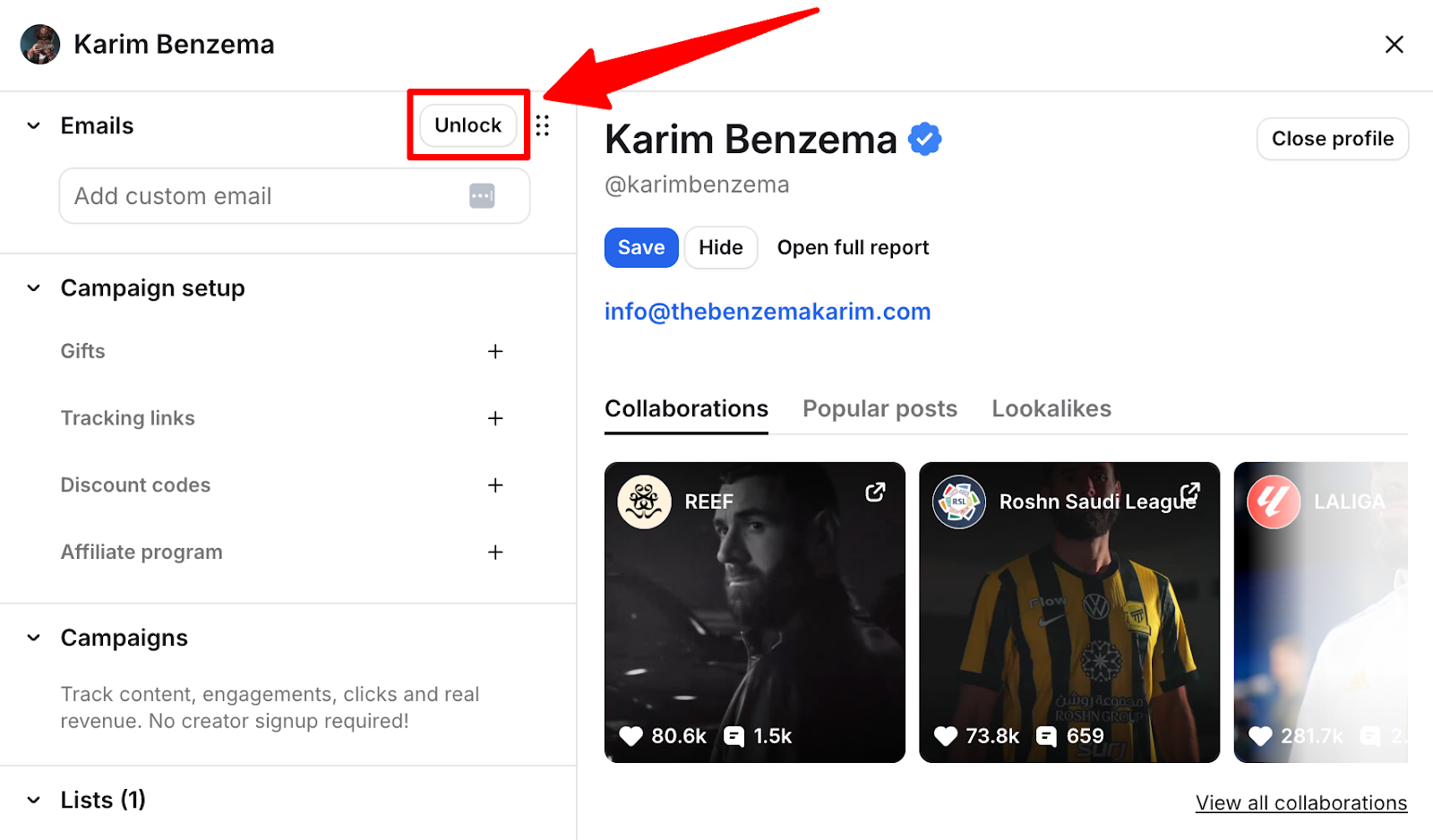 âŚthen open the influencerâs profile and click Unlock to display their email: