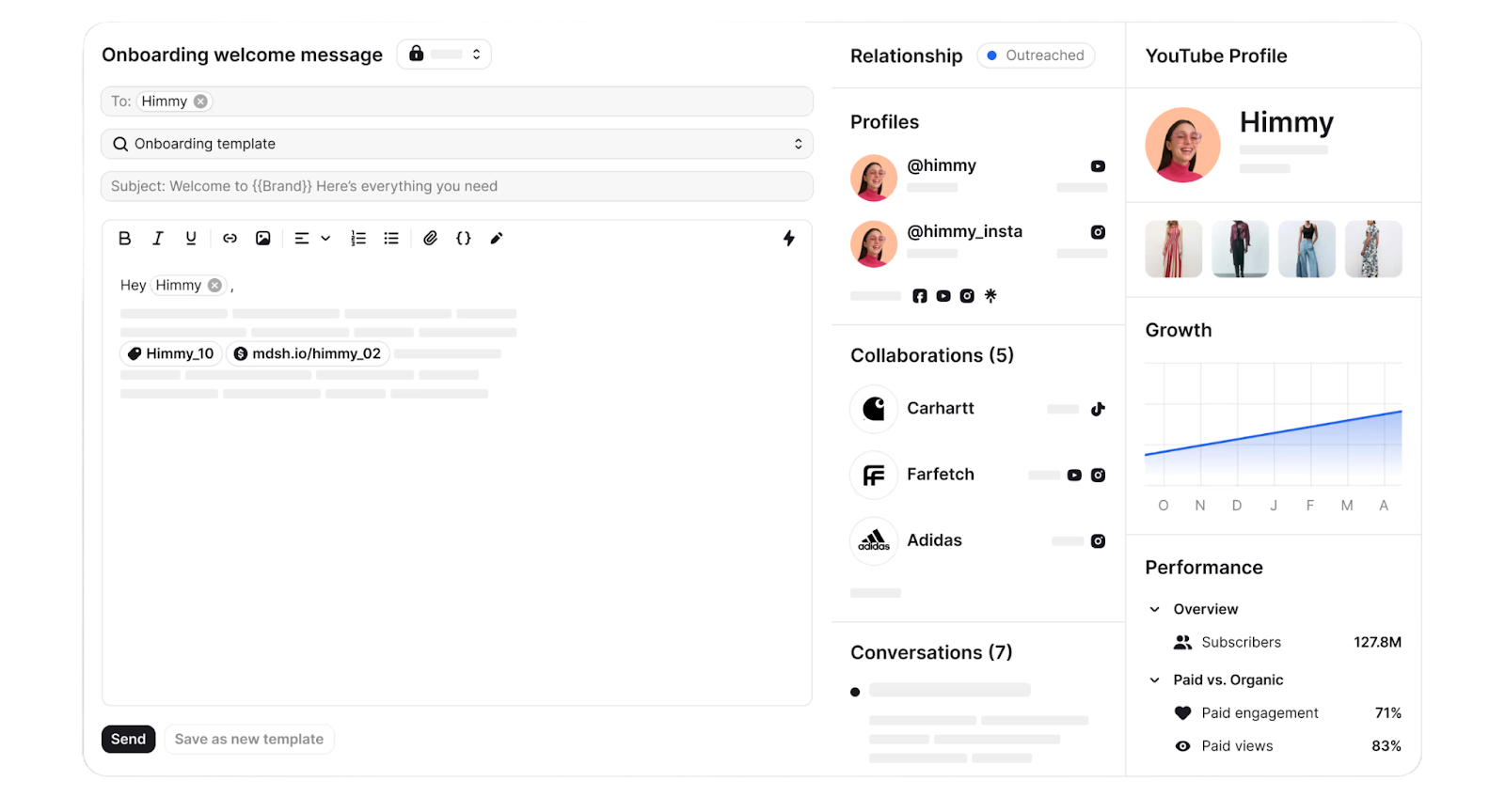 - Reach out to potential affiliate partners using our dedicated influencer marketing inbox, where you can save templates, use variables, and find valuable context to quickly personalize your messaging.