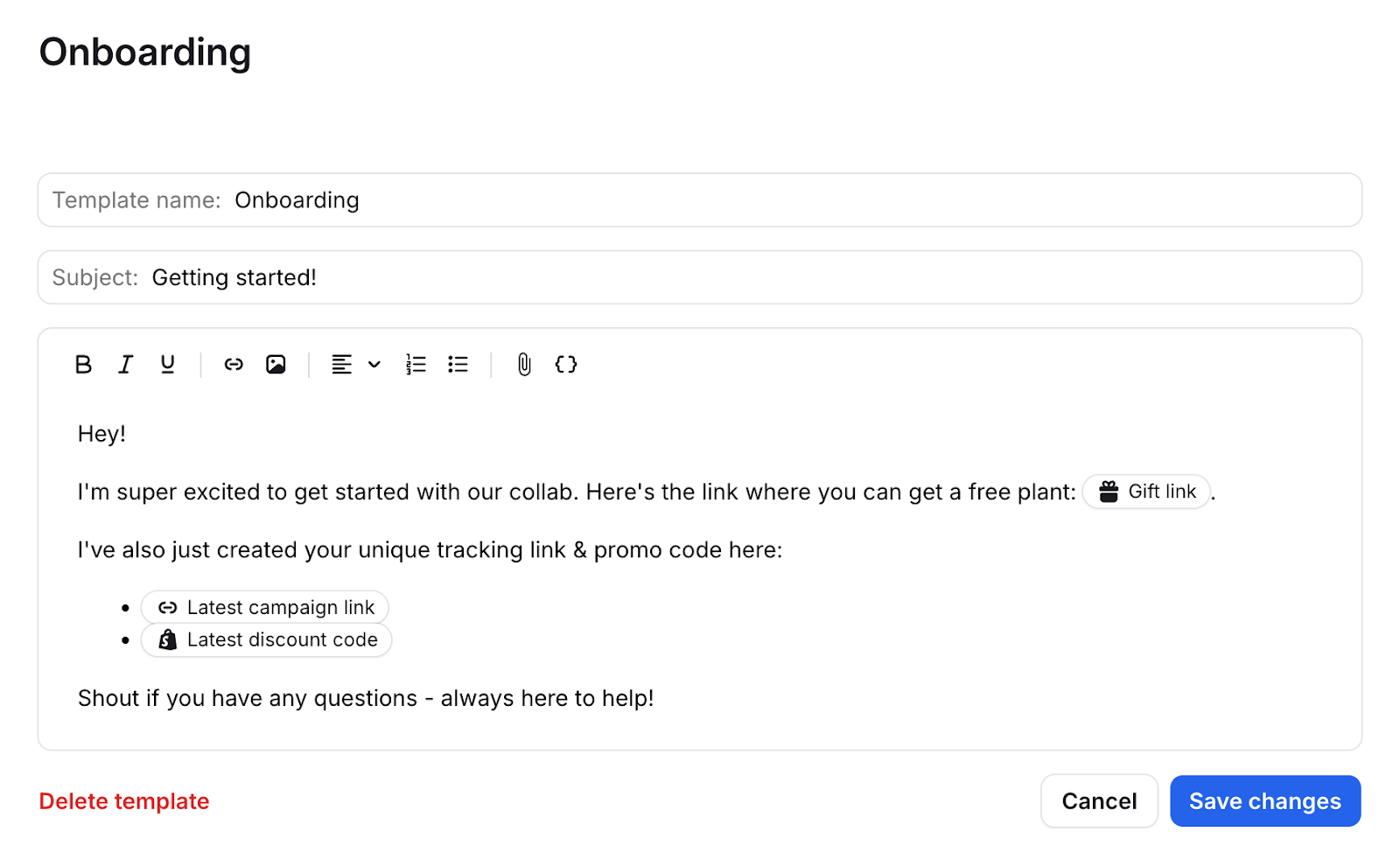Because these emails are (mostly) generic, you can write a template then manually send it to every new affiliate partner you recruit. But itâs easier doing it through Modash â plus you can automatically add variable elements like gift links and discount codes.