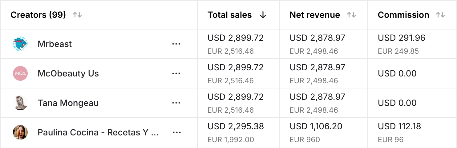 For Shopify stores, Modash tracks total clicks, discount code redemptions, sales, and payouts for all your affiliates, allowing you to see which partners are driving the most revenue for your brand and how much theyâve earned for their efforts (non-Shopify stores donât get the same end-to-end attribution reporting).