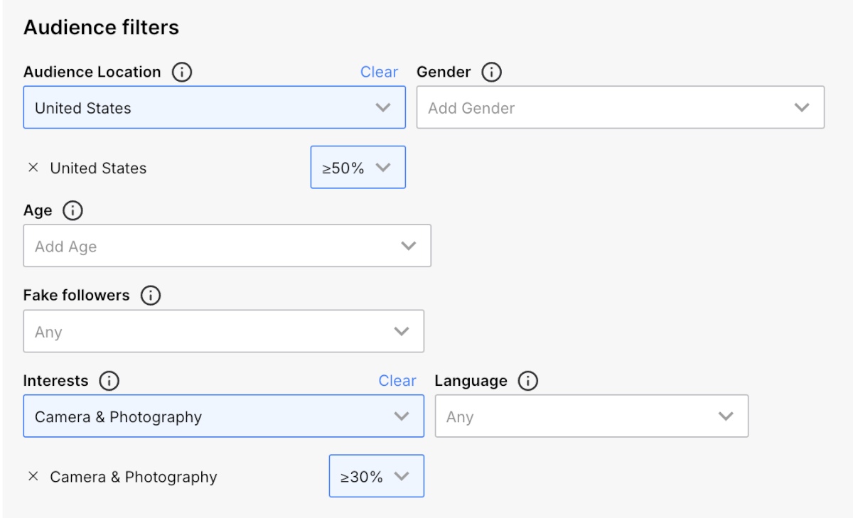 The cherry on top: Modash also helps you filter for an influencer’s audience. After all, it’s equally crucial to ensure a creator has your ICP in their audience (in addition to finding an influencer who’s a brand fit). You can filter for an influencer’s audience on various parameters: