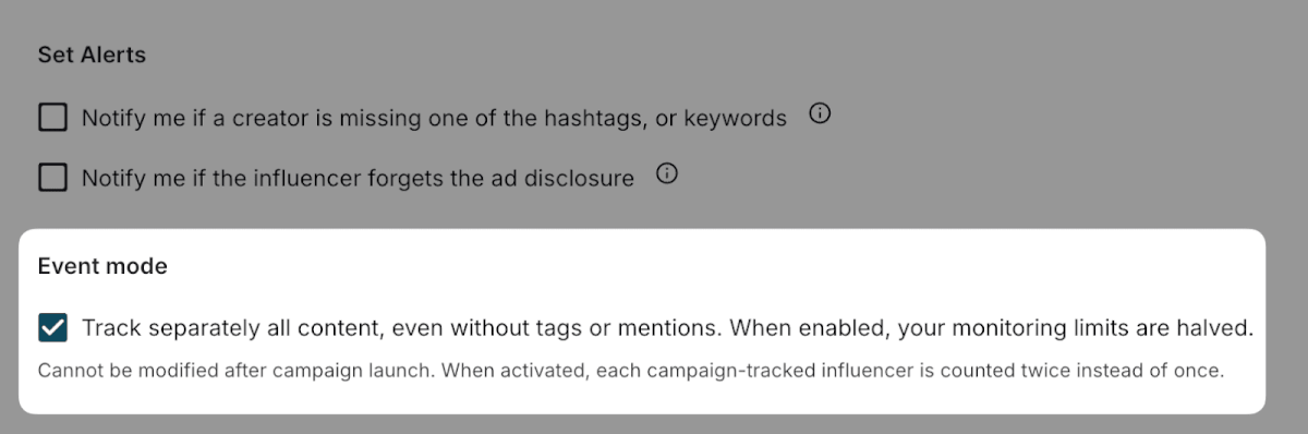The best part? Modash also allows you to track all influencer content under Event Mode. In this feature, Modash will track every single piece of content a creator publishes for a specific date range. Even if an influencer forgets to use your hashtag or tag your brand, you don’t miss a beat because you can handpick and add influencer content under Event Mode to specific campaigns to make accurate reports!
