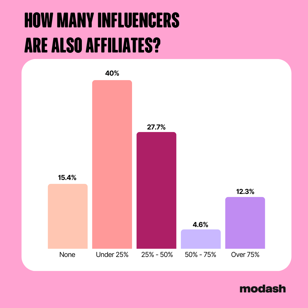 And while brands are spending a lot of energy finding new affiliates, they were barely tapping the partners they already have. Half of our participants said that just under a quarter of their influencer partners also double as their affiliates.