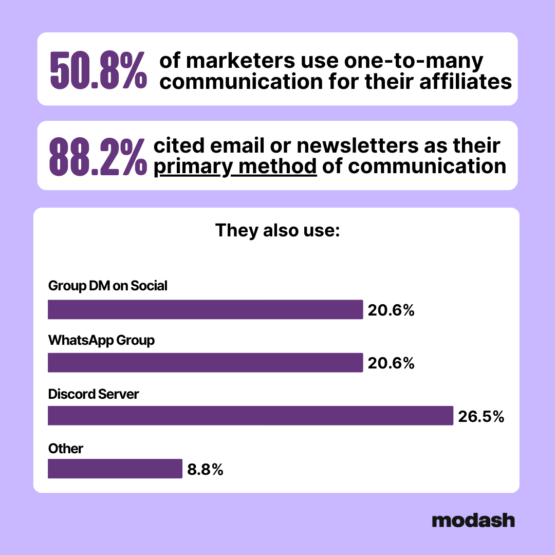 Despite struggling to keep affiliates active, only half of the marketers we surveyed actually use a one-to-many communication channel to keep affiliates active. Now, some of those marketers were using personal 1-on-1 emails to communicate with their affiliates – but that’s got to be a time suck.