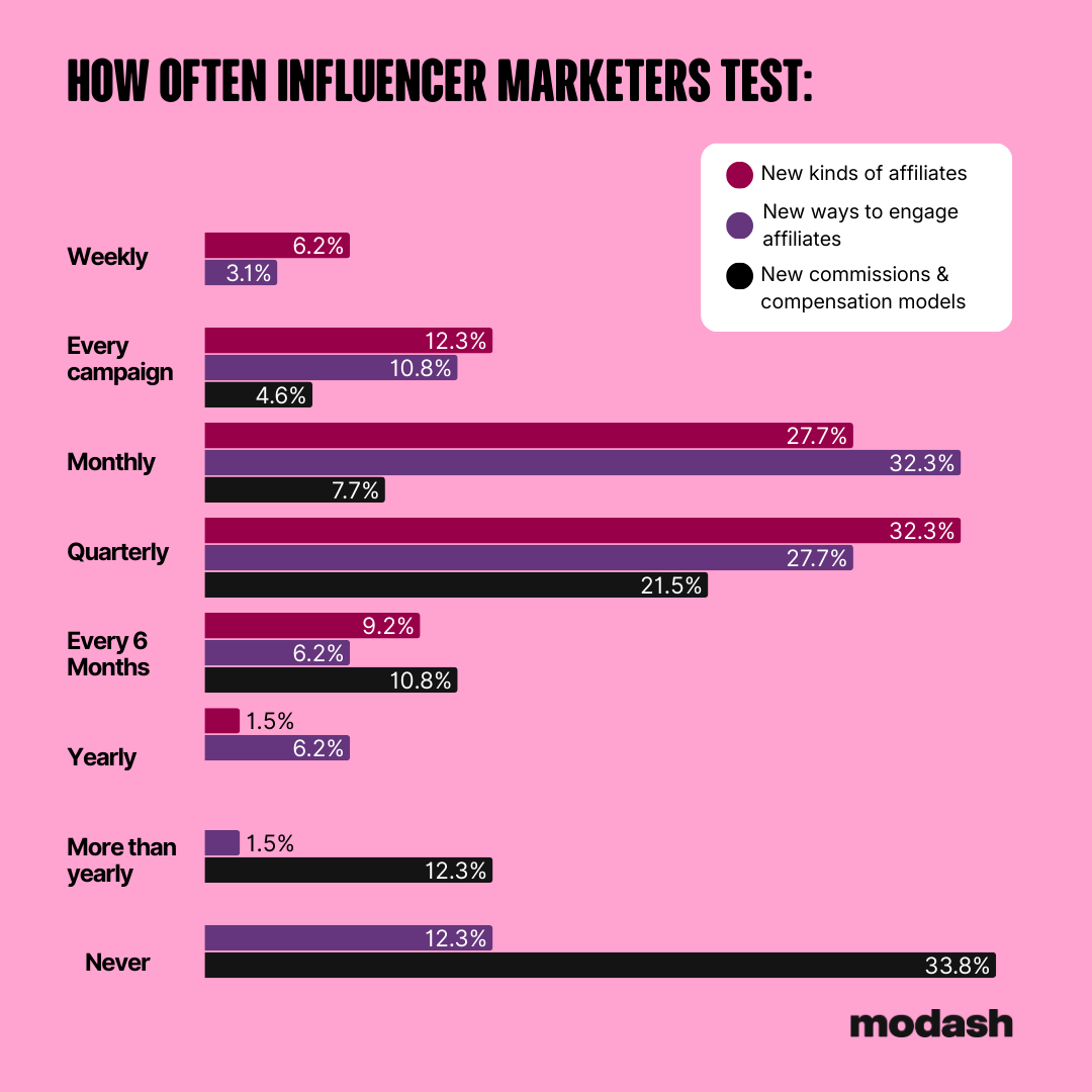 The largest chunk (32.3%) only test new affiliate types quarterly, and 27.7% do it monthly. In a similar vein, marketers are also more reluctant to test new commission models: 33.8% aren’t testing any new payment structures at all.