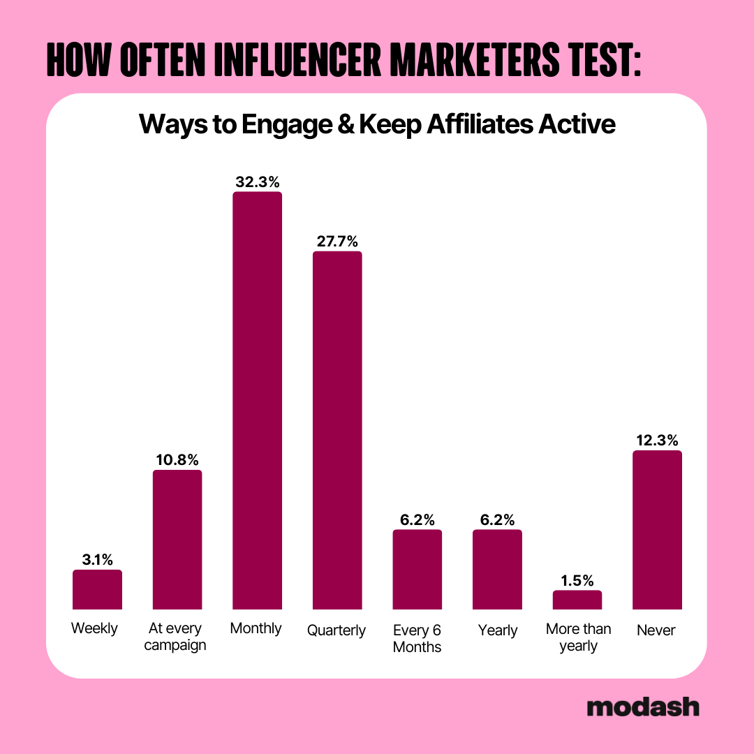 And with engagement being such a significant problem, you’d think that this would be an area where marketers test the most frequently. That’s true, but over a quarter of marketers in our survey are only testing new ways to engage affiliates every six months or longer. By that time, they’re likely pretty cold.