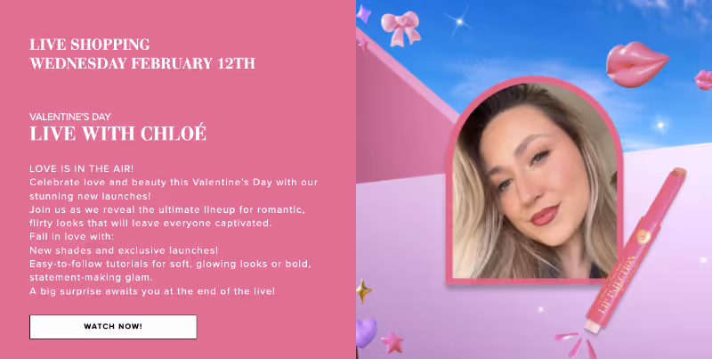 👉 Live shopping, in which brands showcase their products on an influencer-hosted live stream, allowing viewers to buy instantly, like this example from makeup brand Too Faced: