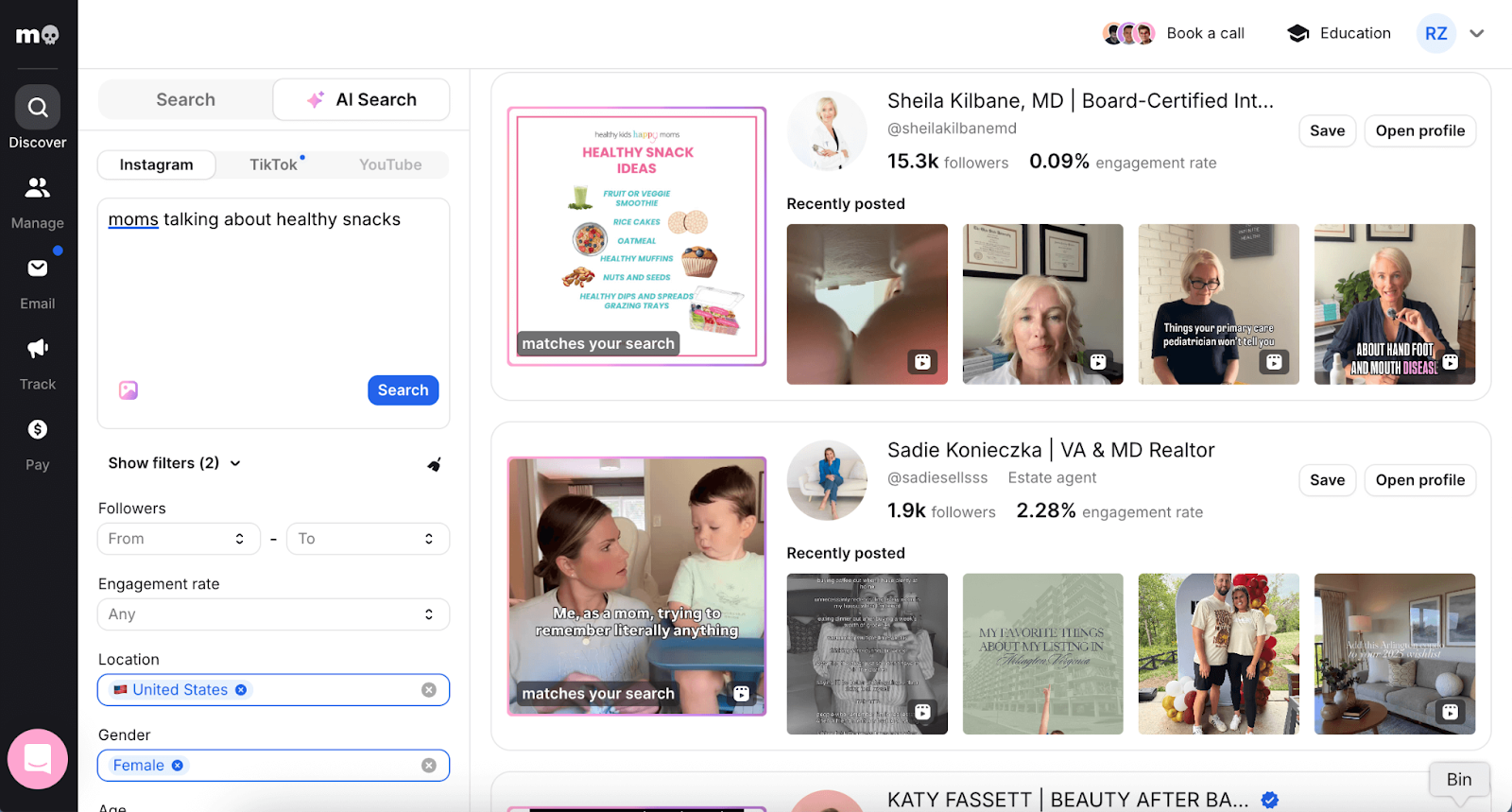 The new way: you open Modash and enter “moms talking about healthy snacks” in the AI search bar. You instantly get a list of mom influencers who already post about your ideal content (talk about a natural fit). You can layer filters like location, follower count, engagement rate, gender, age, language, and more to ensure the search displays only creators who match your criteria to a T.