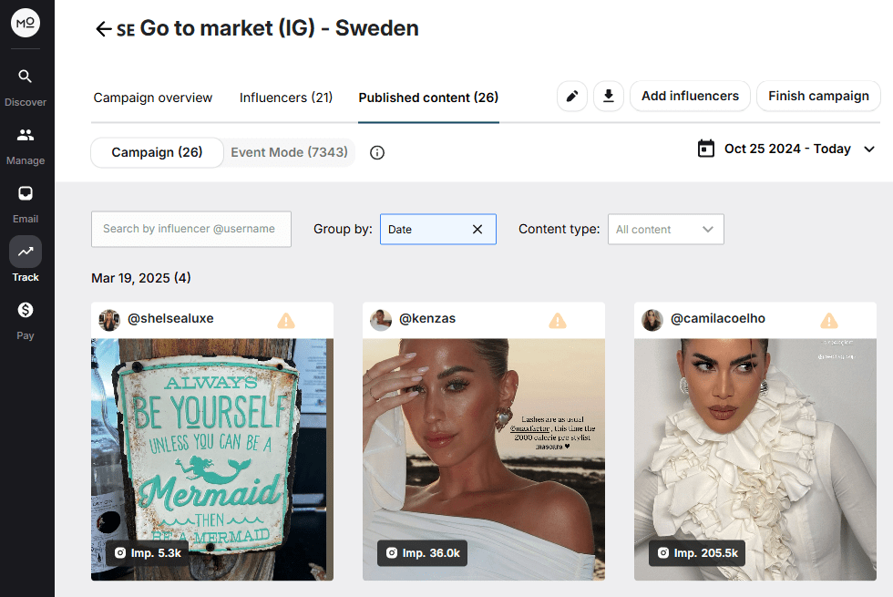 44.7% of marketers in our survey automate these tasks using AI tools. In Modash, for example, you can collect all influencer content that mentions a particular hashtag, brand, or keyword (including Instagram Stories!). You can even collect all the content an influencer posts and then pick the ones you want to track for your campaigns.
