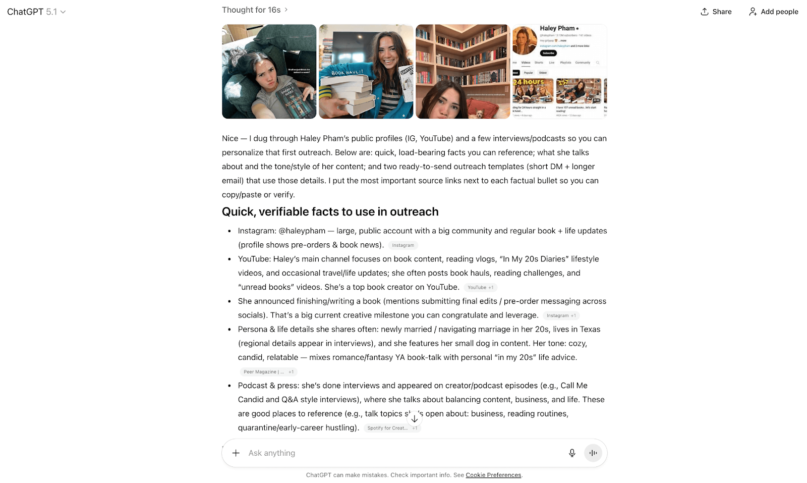 “Act as an influencer marketer reaching out to the book influencer, Haley Pham. Share details about their life and content that can help me personalize my first outreach message to this creator. Dig through their Instagram profile, YouTube channel, and any other podcasts they've been on.”