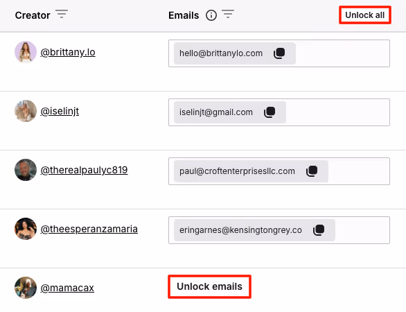 For instance, in Modash, you can add all your would-be influencer partners to a list, then instantly view their publicly available emails – plus unlock any addresses that aren’t listed publicly.