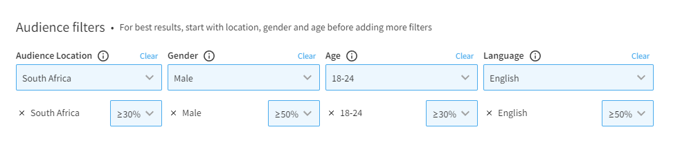 Jeder dieser Filter kann auch prozentual gesteuert werden. Nur sehr wenige Creator werden beispielsweise 100 % ihrer Follower in Südafrika haben. Um meine Suche zu erweitern, könnte ich festlegen, dass die Ergebnisse mindestens X % Follower in meinem Zielland haben sollen.