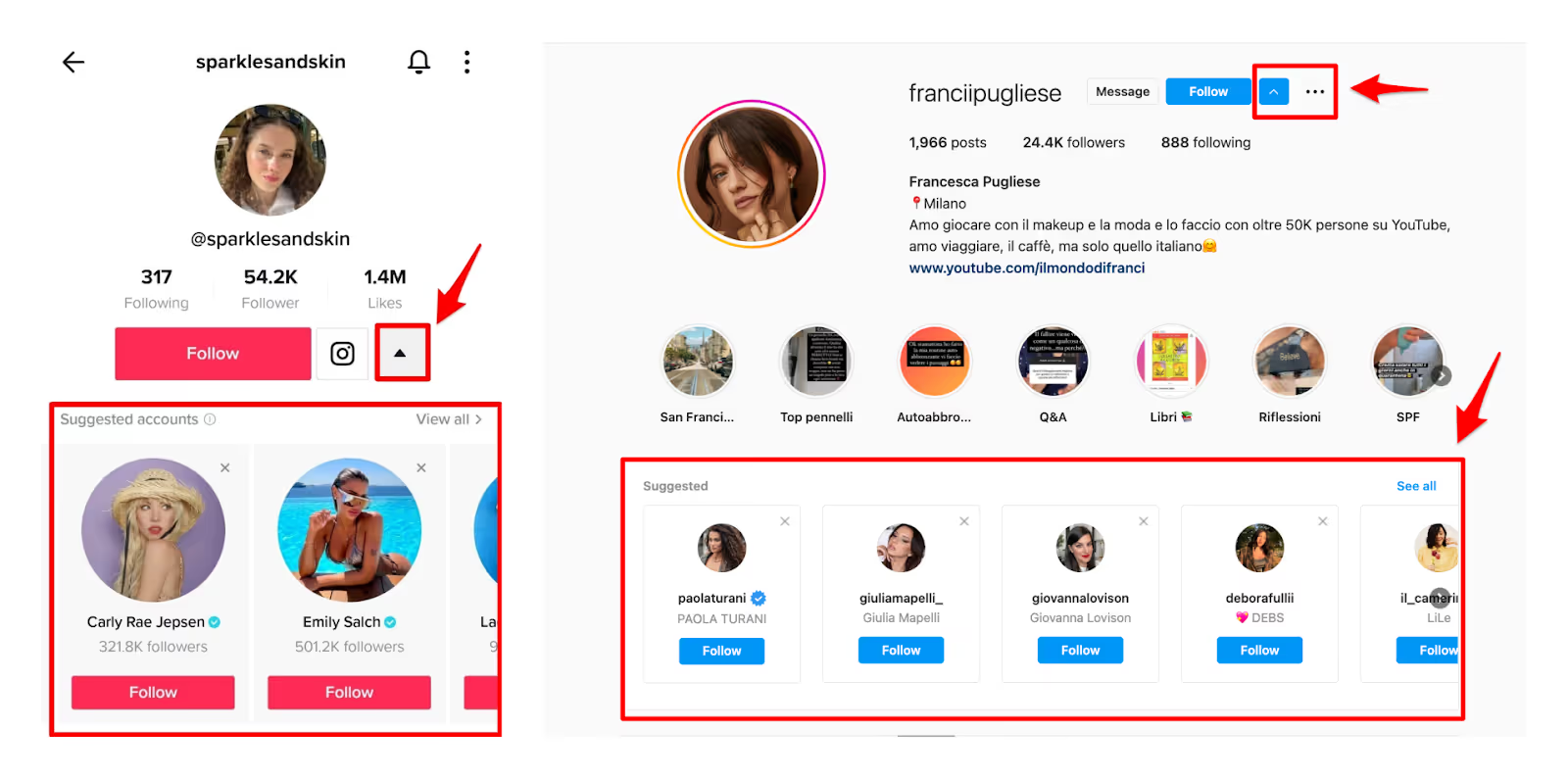 Sie haben einen Micro-Influencer gefunden, der Ihnen gefällt? Finden Sie ähnliche über den „Nach-unten“-Pfeil auf Instagram und TikTok:
