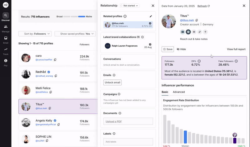 Mit Modash können Sie ganz einfach Influencer identifizieren, die Ihren Suchkriterien entsprechen, ihre Audience- und Performance-Kennzahlen analysieren und ihren bestehenden Sponsored Content einsehen – und das alles, ohne sie zunächst anschreiben zu müssen. Wenn sie passen, fügen Sie sie einfach einer automatisierten E-Mail-Sequenz hinzu. Ganz unkompliziert!