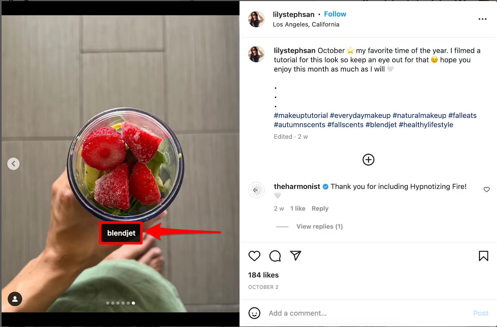 Beispielsweise postete die Beauty- und Wellness-Micro-Influencerin Lily Alltagsfotos und erwähnte BlendJet (zusammen mit einigen anderen Marken) in ihrem Beitrag, ohne darum gebeten worden zu sein oder dafür bezahlt zu werden.