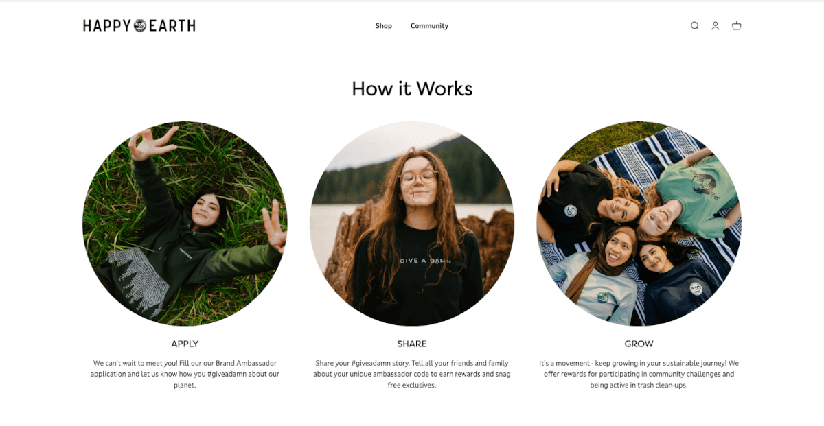 🛬 Inbound bedeutet, dass die Influencer zu dir kommen. Dafür kannst du ein Botschafter-Programm entwickeln und es über deine Social-Media-Kanäle oder eine spezielle Seite auf deiner Website promoten, wie es zum Beispiel die Bekleidungsmarke Happy Earth mit ihrer Landingpage macht.